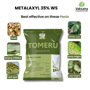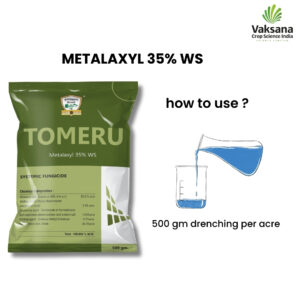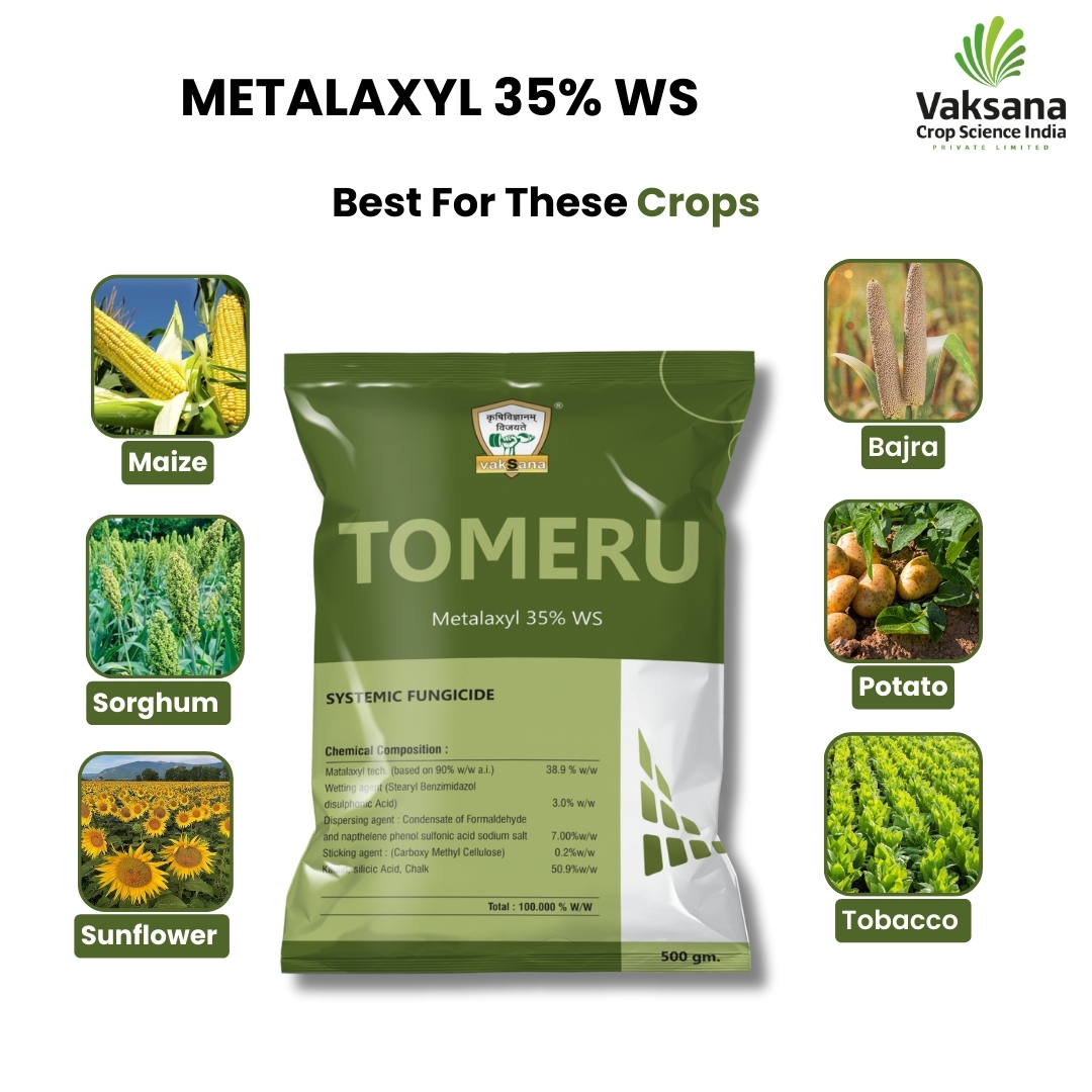 TOMERU (Metalaxyl 35% WS) is a systemic fungicide. It is used to control leaf spot and rust disease of different types of crops like potatoes, chili, cauliflower, cabbage, peas, groundnut, paddy, wheat, sugarcane, etc. It controls downy mildew in maize, bajra, sorghum, sunflower, and white rust in mustard.